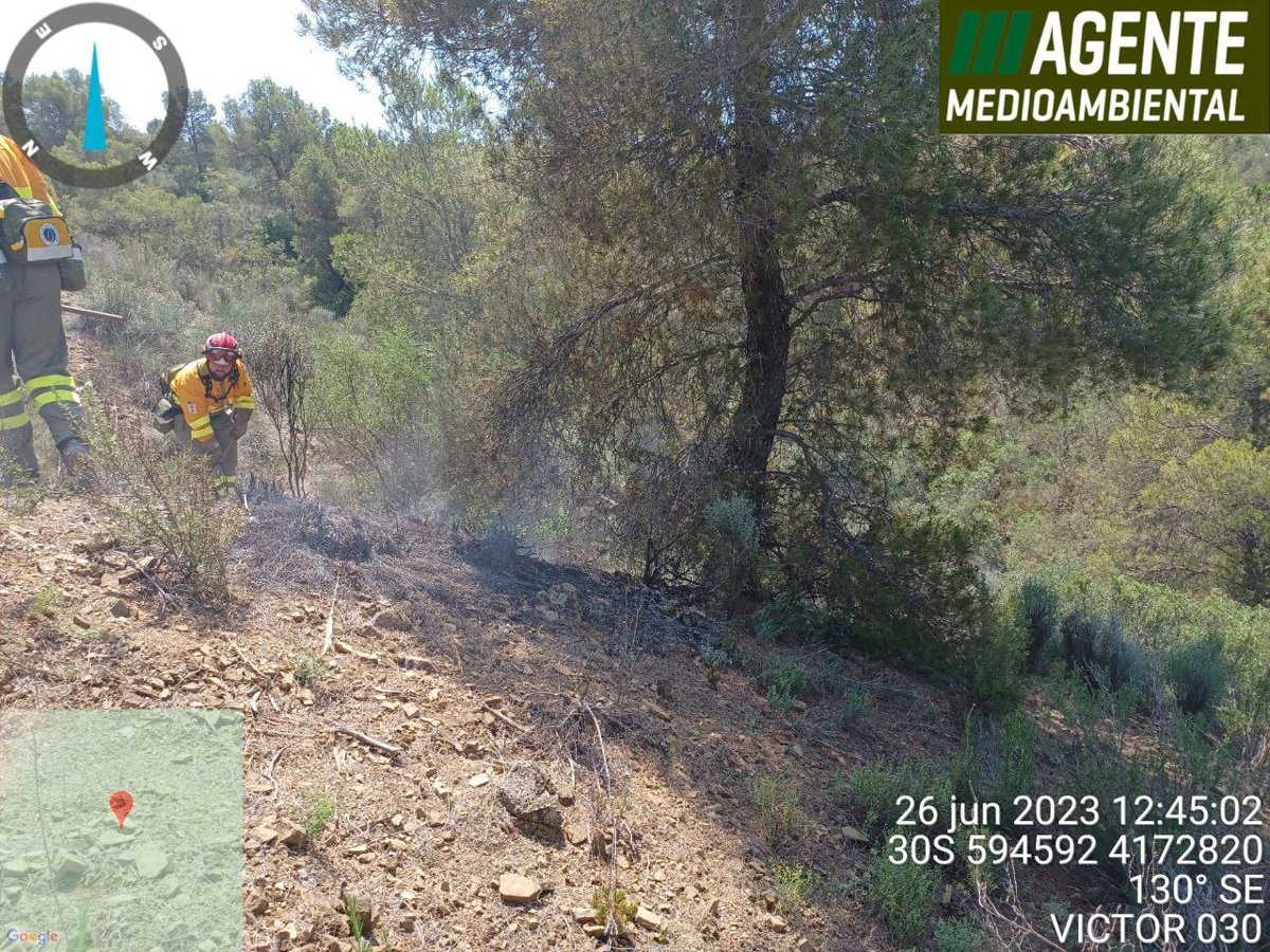 A las 13.09 horas, el técnico de extinción de la Dirección General del Medio Natural ha dado por extinguido el fuego, que, según las primeras hipótesis, pudo ser provocado por un rayo. Ha quedado en conato y afectado a menos de 100 metros cuadrados de terreno.