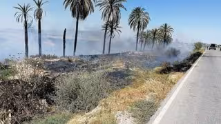 El Centro de Coordinación de Emergencias '1-1-2' Región de Murcia ha recibido diversas llamadas, a partir de las 14.21 horas, informando del fuego, declarado en una zona de rambla. El fuego ha alcanzado unas palmeras ubicadas en el lateral de la rambla.