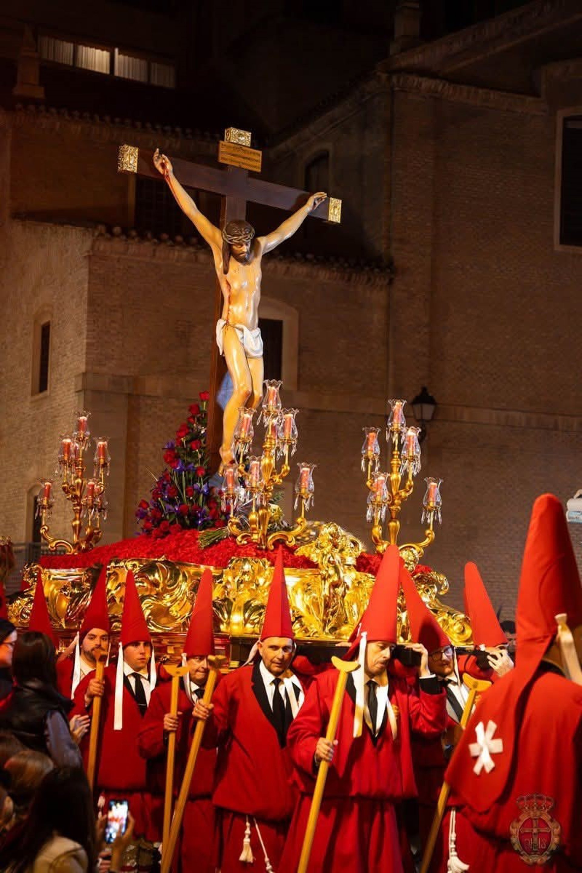 A las 19.00 horas es el turno de la Muy Ilustre y Venerable Cofradía del Santísimo Cristo de la Caridad. Las túnicas corintas partirán de la Iglesia de Santa Catalina desde donde desfilarán sus nueve pasos.