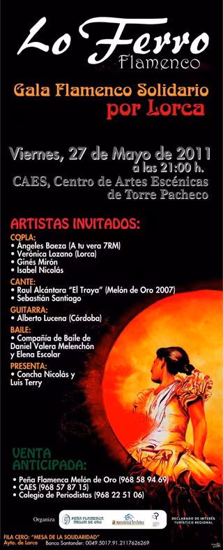 El Festival de Cante Flamenco de Lo Ferro ha brindado su apoyo a Lorca organizando para este viernes un Espectáculo de Flamenco y Copla, organizado de forma conjunta con el Ayuntamiento de Torre Pacheco y el Colegio de Periodistas de la Región de Murcia.