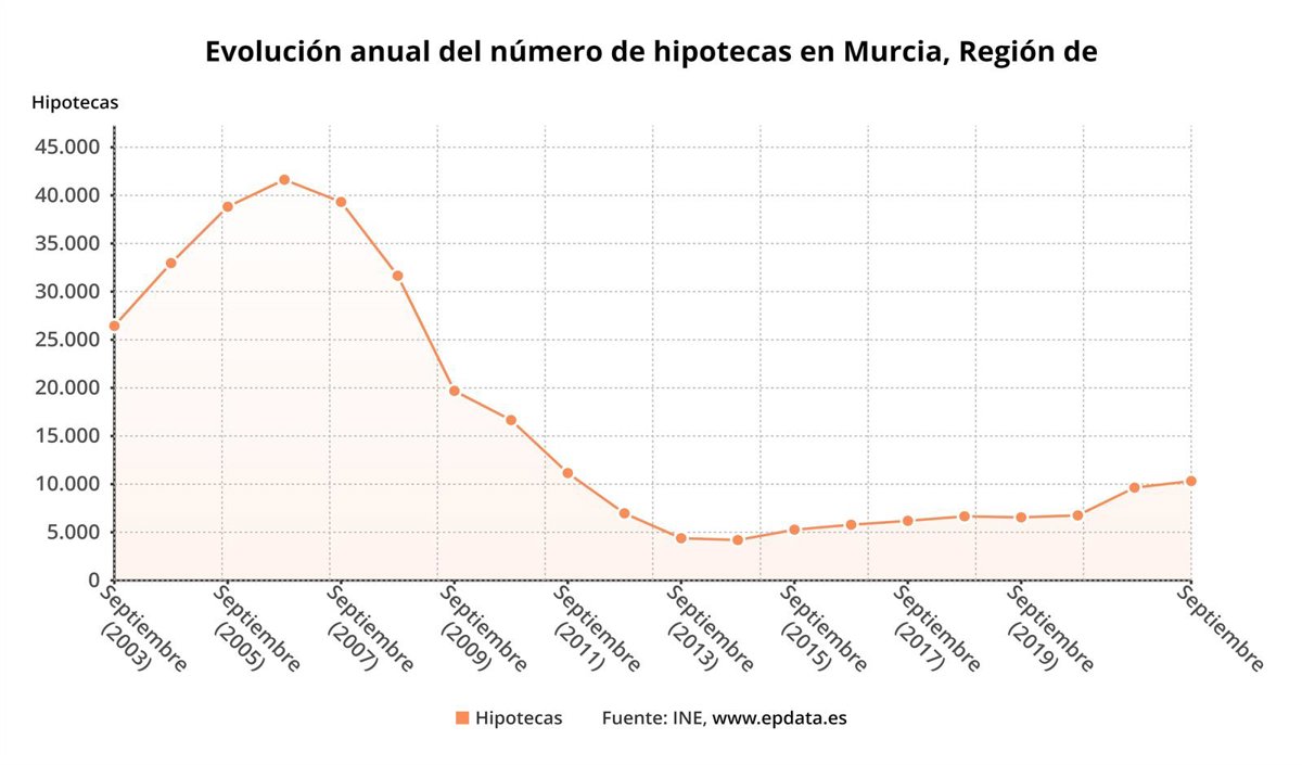 En tasa intermensual (septiembre sobre agosto), las hipotecas sobre viviendas subieron un 59,9% en la Región de Murcia, mientras que en el conjunto del país se registró un aumento del 20,1%.