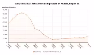 La Región de Murcia registró en agosto la firma de 1.099 hipotecas sobre viviendas, lo que supone un 91,5% más que en el mismo mes del año anterior, el segundo mayor incremento por comunidades solo inferior al de Valencia (95,6%).