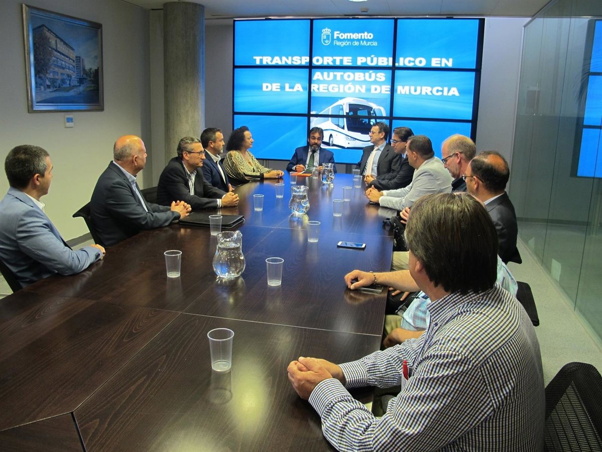 El consejero de Fomento e Infraestructuras, Pedro Rivera, se ha reunido esta mañana con el presidente de la Federación Empresarial de Transporte en Autobús (Fenebús-Murcia), José Luis Sánchez, y miembros de esta entidad para estudiar aspectos relacionados con el transporte en autobús en la Región.