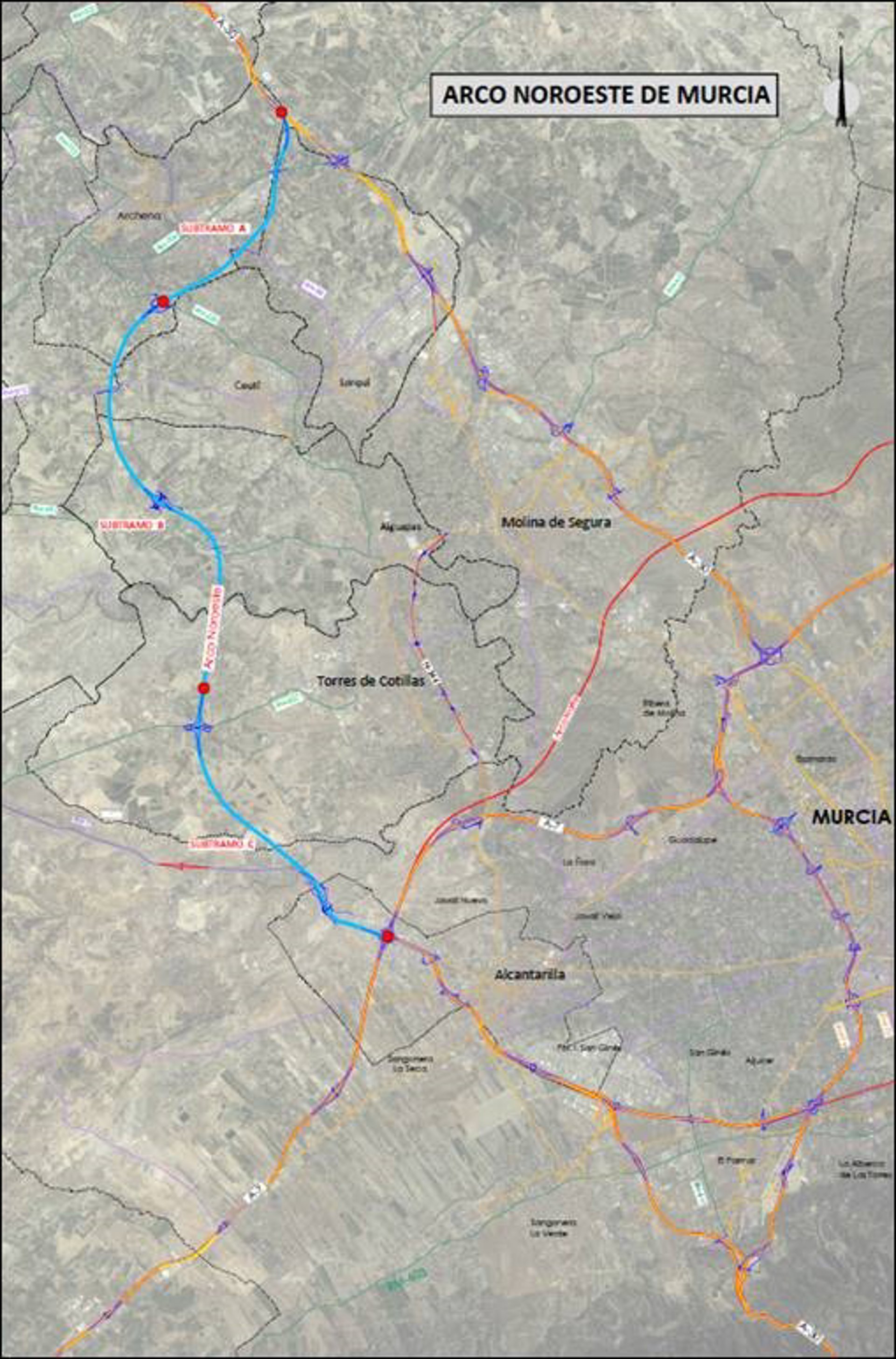El Arco Noroeste dispondrá también de 4 enlaces intermedios con las carreteras autonómicas RM-533, RM-531, RM-B37 y RM-15, que permitirán mejorar las condiciones de circulación, especialmente de vehículos pesados, en los municipios de Archena, Lorquí, Ceutí, Alguazas, Las Torres de Cotillas y Murcia.