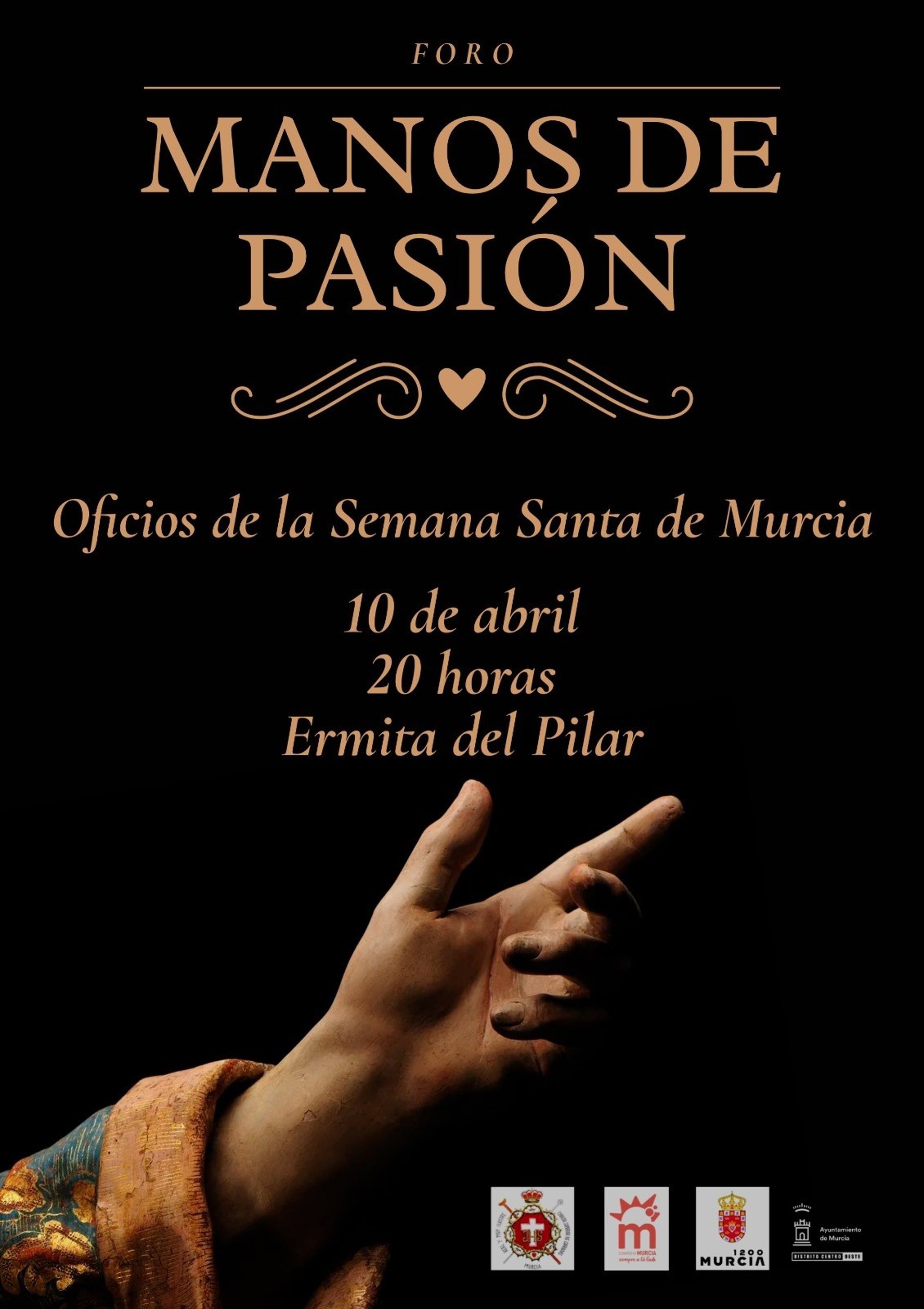 La Concejalía de Turismo, Comercio y Consumo del Ayuntamiento de Murcia ha organizado el foro 'Manos de Pasión', un evento enmarcado en la iniciativa 'Murcia 1200' que se celebrará este jueves, a las 20.00 horas, en la ermita del Pilar, y que pondrá en valor los oficios tradicionales de la Semana Santa.