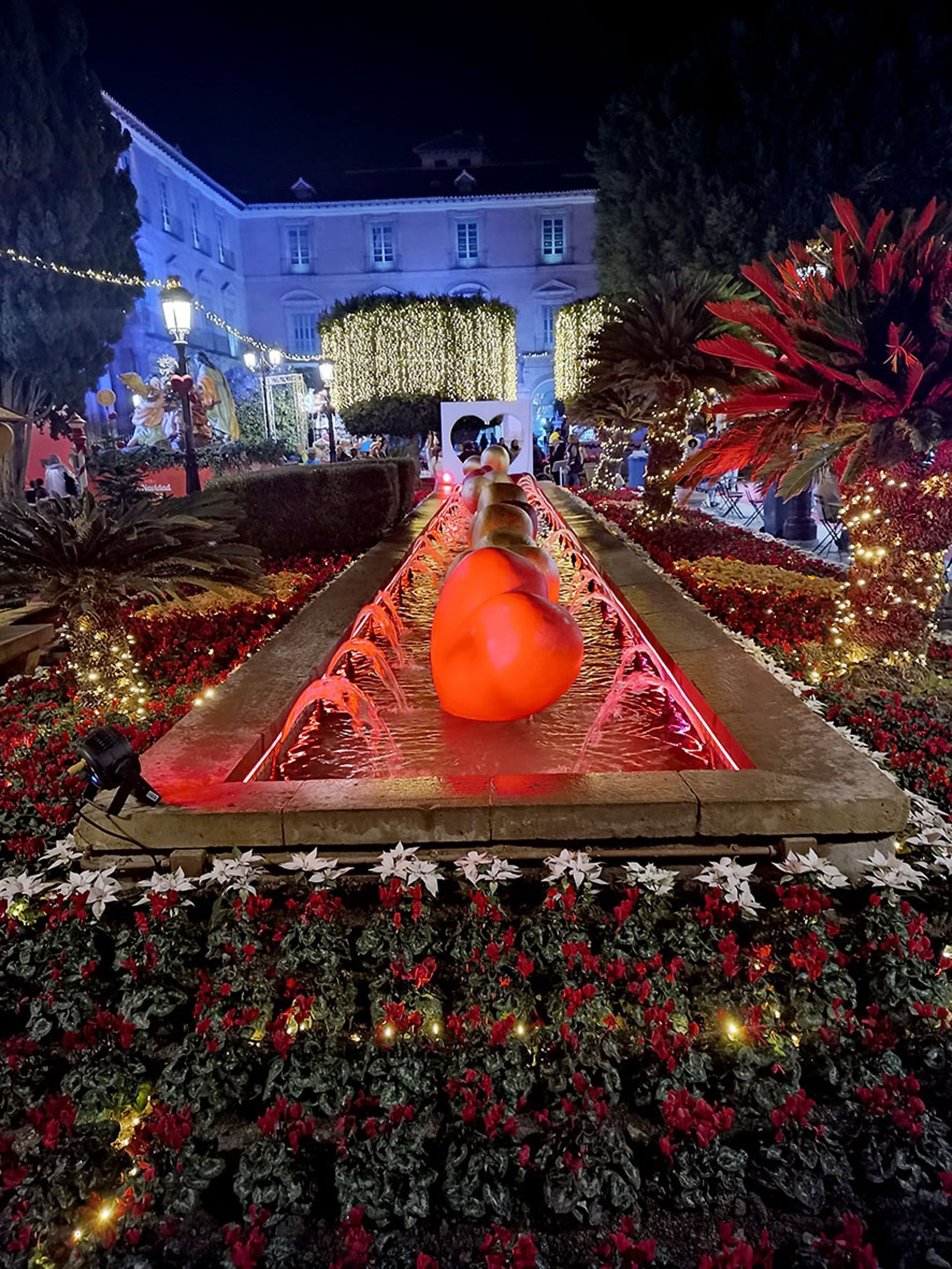 Así, se puede encontrar esta iluminación en los lagos del jardín de La Seda, San Ginés y Parque de Fofó, y en fuentes como las ubicadas en la plaza Glorieta y avenida Primero de Mayo, al igual que en pedanías como el Barrio del Progreso, Sangonera la Verde y Javalí Viejo.