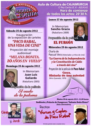 La Asociación Milana Bonita, recordando a Paco Rabal en las fechas conmemorativas de su fallecimiento, ha elaborado a partir de este sábado y hasta el miércoles, día 29, una variada programación enmarcada, además, en los actos que, durante todo este 2012, celebran el 10º aniversario de su constitución.