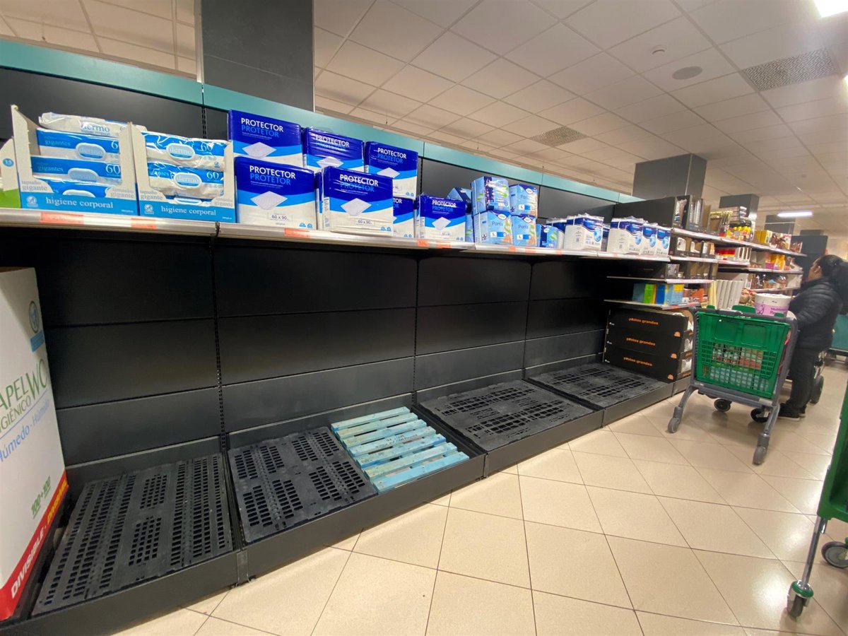 A nivel nacional, el gasto en productos de gran consumo se ha disparado hasta un 180% ante la creciente preocupación por el avance del coronavirus, lo que ha provocado una avalancha de compras, fundamentalmente en los canales de droguería y perfumería, 'online', hipermercados y supermercados.