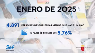 El Gobierno murciano ha valorado que la Región de Murcia comienza 2025 con casi 5.000 parados menos que hace un año. De esta manera, la Comunidad cuenta con 4.891 personas desempleadas menos, según los datos de empleo correspondientes al mes de enero que se han conocido hoy. En estos últimos doce meses, la cifra de parados ha caído un 5,76 por ciento.
