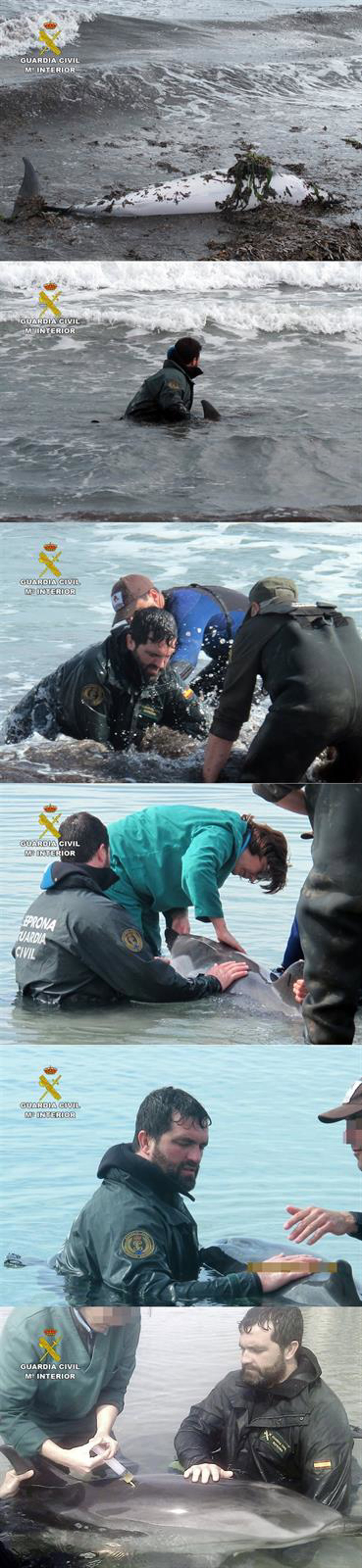 Con el fin de mantenerlo con vida, uno de los guardias civiles se introdujo en el mar para proceder a su auxilio inmediato, por una parte introduciendo al animal en el mar mientras lo sujetaba para mantenerlo a flote, procurando, a su vez, que su estado de hidratación no disminuyese.