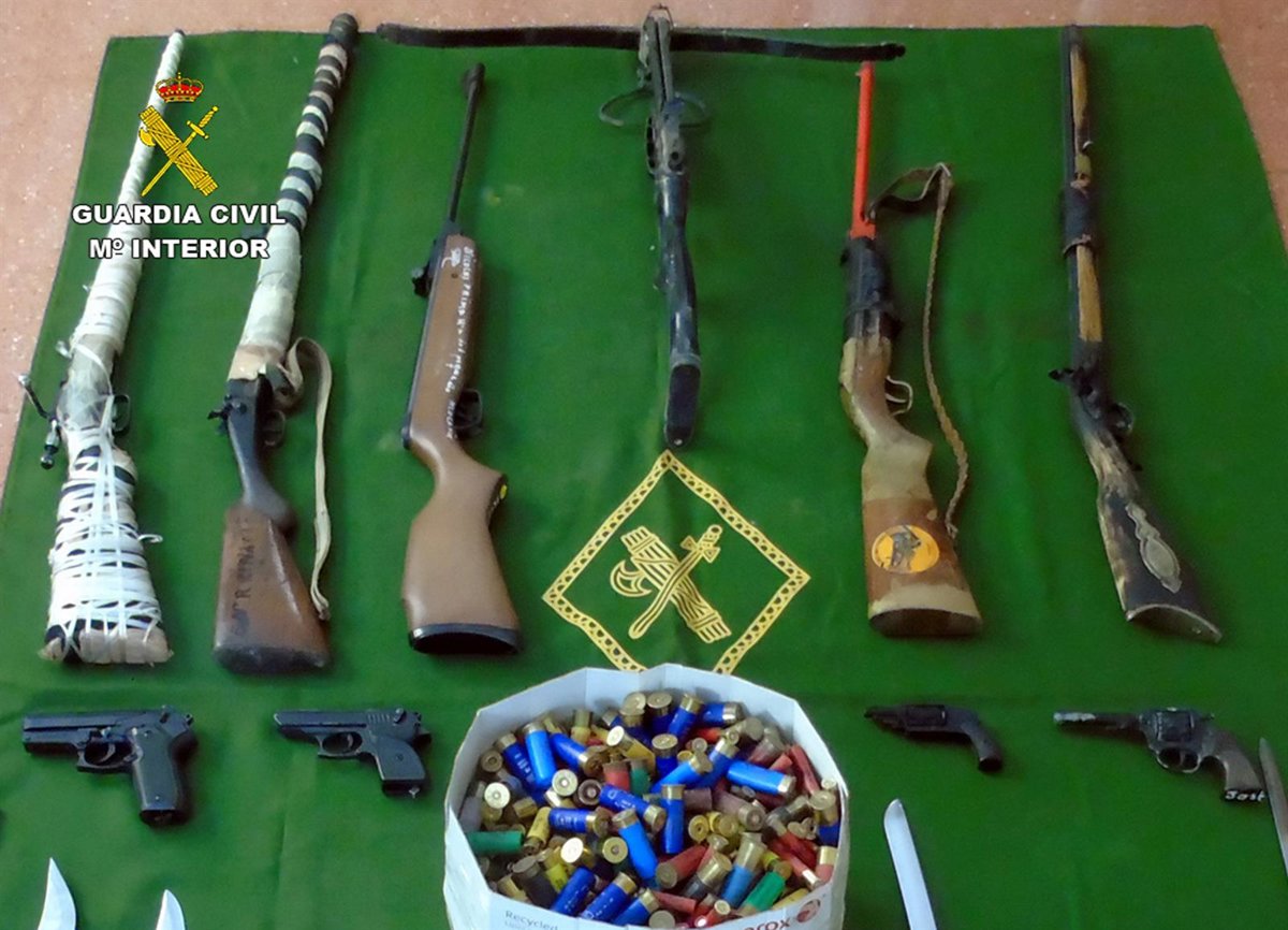 En total, los guardias civiles se han incautado de cinco armas cortas, cinco armas largas, una ballesta, una defensa extensible, abundantes armas blancas (catanas, machetes, navajas) y más de 1.300 cartuchos de calibres diferentes.
