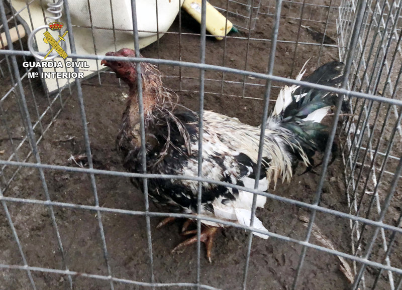 Los agentes también localizaron 27 jaulas, tipo box y siete jaulas de reja metálica con dos gallos de combate (de raza inglesa y española) que presentaban las crestas y las barbillas mutiladas, heridas en la parte superior del cuello y las patas ensangrentadas. Los restos de las crestas mutiladas se hallaron junto a las jaulas metálicas.