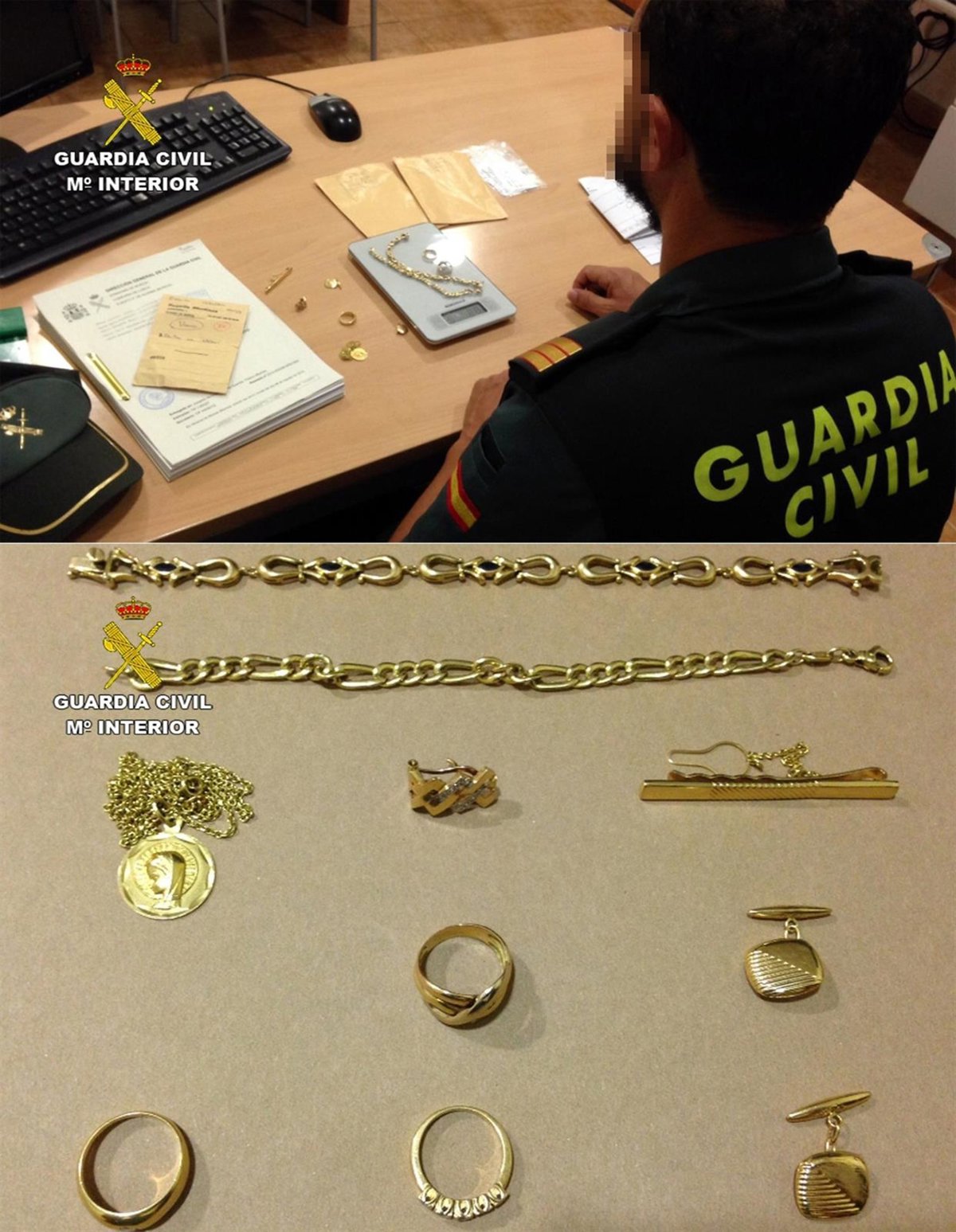 De la docena de inspecciones realizadas por la Benemérita en comercios de distintas localidades dedicados a la compra-venta de este tipo de objetos ha resultado la localización de un total de 10 piezas de oro coincidentes con las denunciadas por la víctima, que han sido recuperadas y entregadas a su legítimo propietario.