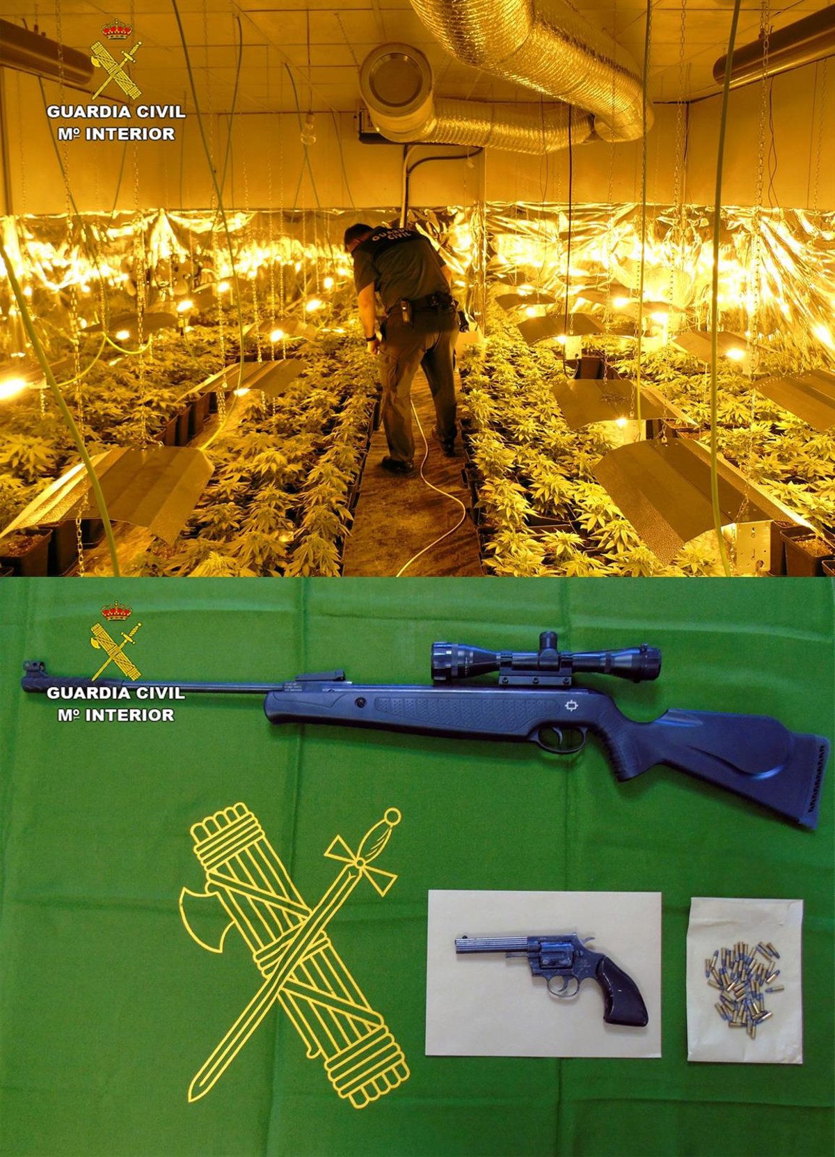 El registro de este recinto se saldó con la incautación de una carabina de aire comprimido, 400 plantas de cannabis sativa, así como números útiles y productos empleados para su cultivo interior tales como 38 focos, cinco turbinas de extracción de aire, termostatos, ventiladores, filtros, aparatos de aire acondicionado y gran variedad de productos fitosanitarios empleados para favorecer el crecimiento de las plantas, todo lo cual resultó incautado.