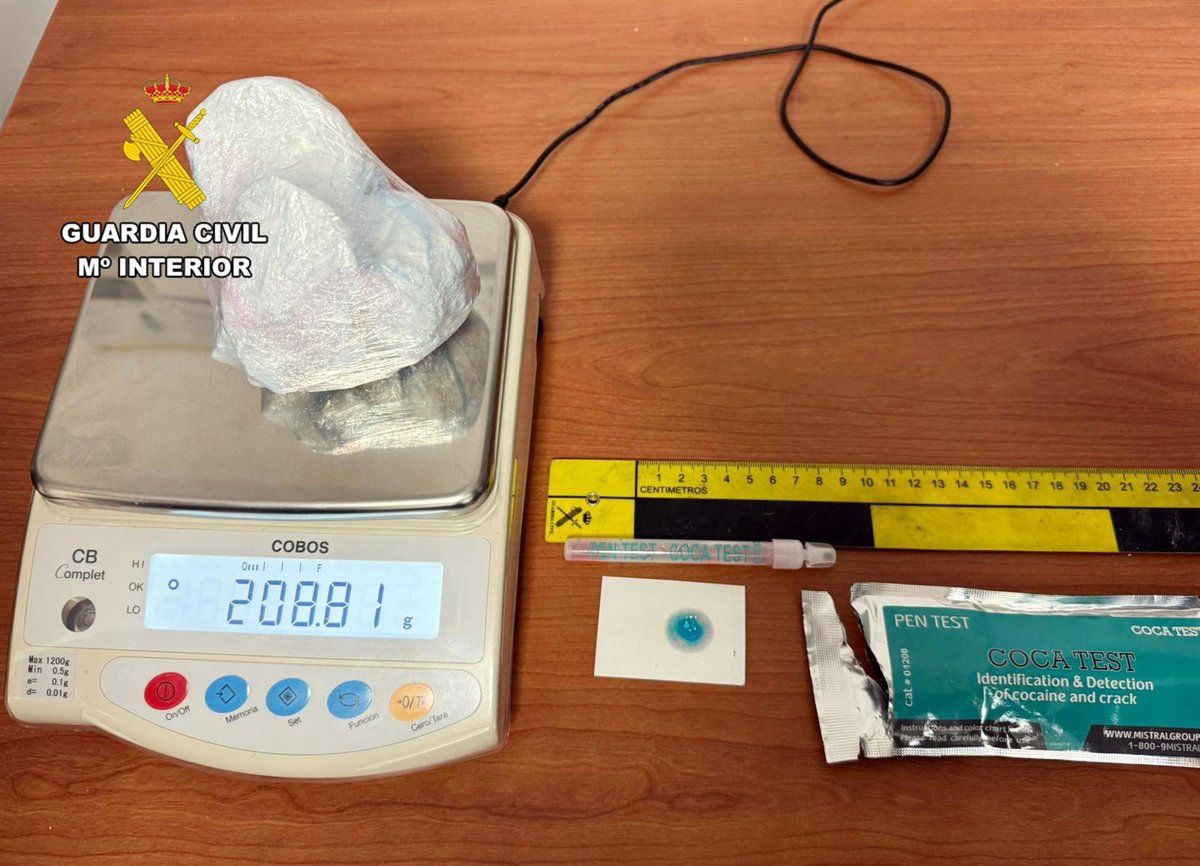 La Guardia Civil lo interceptó e identificó a sus ocupantes que respondieron de forma confusa, lo que resultó sospechoso. Los agentes inspeccionaron el vehículo y sus pertenencias localizando, oculto bajo la vestimenta de uno de los hombres, un envoltorio con sustancia blanca en roca que, después de ser sometida a drogatest, resultó ser cocaína. El peso total resultó ser de 208,83 gramos.