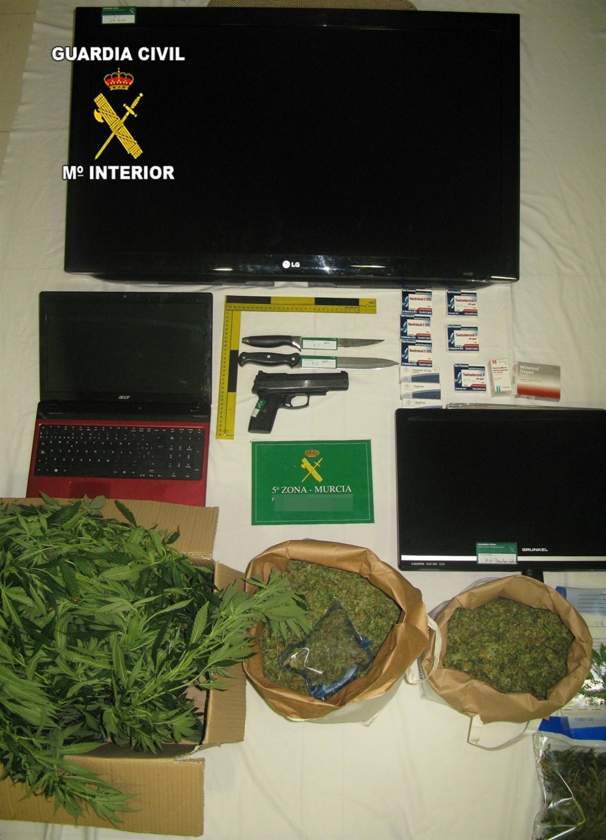 En el registro domiciliario, los agentes incautaron 96 dosis de sustancias anabolizantes, que comercializaban en el mercado ilegal, una pistola de gas comprimido y dos armas blancas, así como la incautación de 1.635 gramos de marihuana en cogollos, que se encontraban ocultos en el interior del motor de uno de los vehículos que utilizaba el grupo. Además, se han intervenido dos turismos de alta gama, un ordenador portátil, dos televisores y diverso material tecnológico.