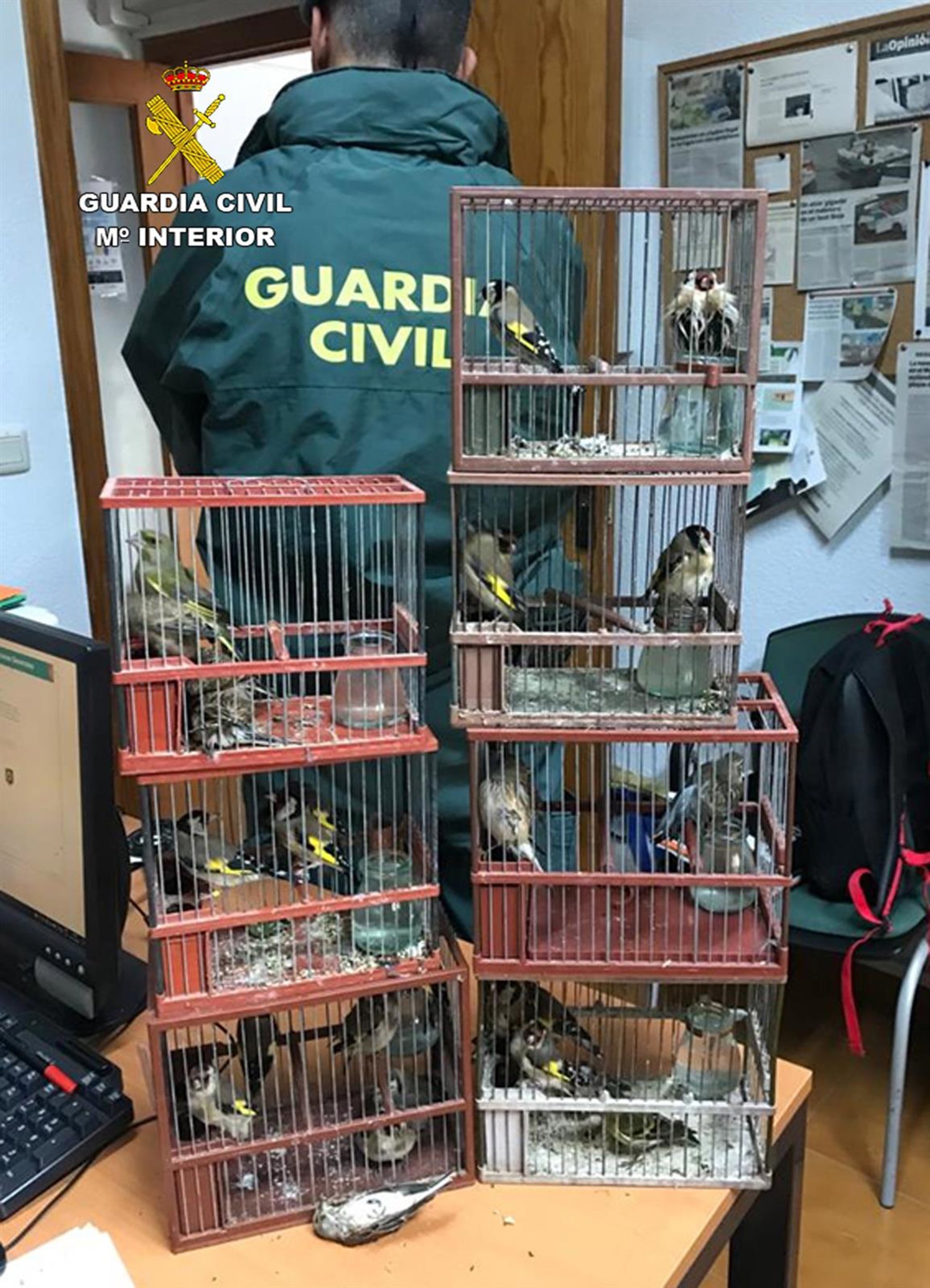 Junto a la red, y en sus alrededores, había colocado ocho jilgueros y un lúgano a modo de reclamo y cimbeles para atraer a las aves fringílidas y poder capturarlas. Además, los agentes hallaron diez jilgueros, ocho pardillos y un verderón que, al parecer, acababan de ser capturados.