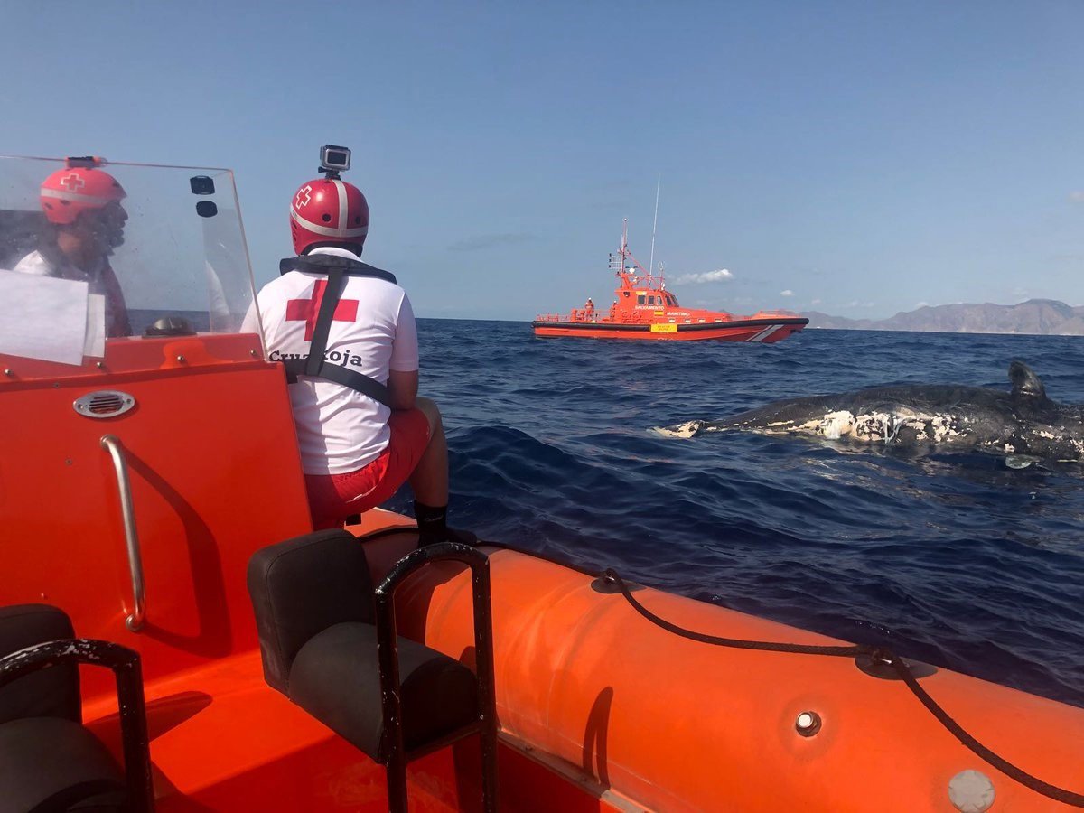 Ante el avistamiento de un gran cetáceo a la deriva, Cruz Roja y la embarcación Salvamar Mimosa de Salvamento Marítimo se desplazaron al lugar donde se encontraba.