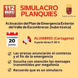 Para que toda la población de Alumbres conozca los detalles, procedimientos y qué hacer exactamente durante el simulacro, se ha organizado una charla informativa en el Local Social de Alumbres este miércoles, 19 de noviembre, a las 19.00 horas. La charla la imparte la Dirección General de Emergencias de la Comunidad Autónoma.