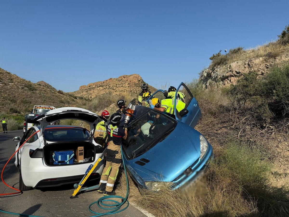 Una mujer de 26 años ha tenido que ser rescatada por los bomberos, atendida por los sanitarios y trasladada al hospital tras colisionar el turismo que conducía contra otro vehículo en la carretera RM-D17 (Almendricos-Puerto Lumbreras), en el término municipal de Lorca (Murcia).