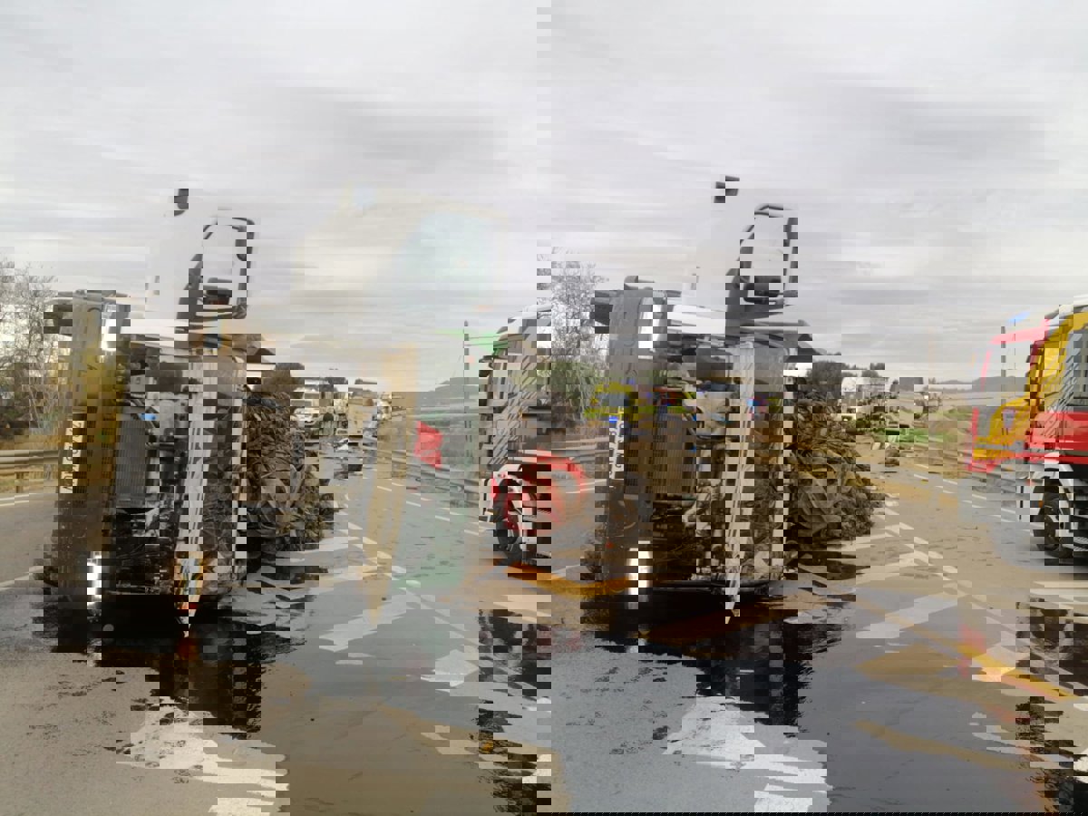 Una persona ha resultado fallecida y 13 heridas al volcar un camión sobre un autobús que transportaba trabajadores en la carretera que une Lorca (Murcia) y Pulpí (Almería), en el puente de salida de Las Escarihuelas, en el término municipal de Lorca.