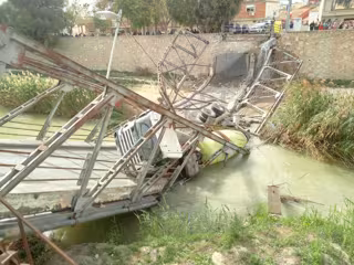 El Centro de Coordinación de Emergencias 1-1-2 Región de Murcia ha recibido varias llamadas a partir de las 16.29 horas informando de la caída del camión hormigonera al río tras ceder a su paso el puente de El Secano, en Beniel.