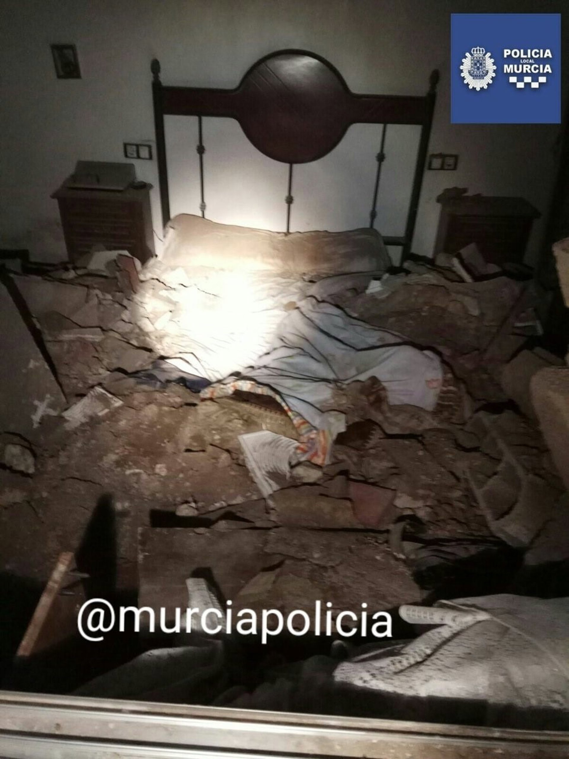 Bomberos de Murcia acudieron al domicilio para rescatar al hombre que quedó semisepultado por parte del forjado del tejado-terraza cuando se encontraba durmiendo.