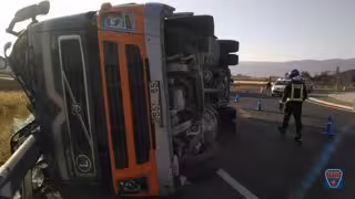 Un hombre de 47 años ha resultado herido tras volcar el camión frigorífico que conducía en la A-33, en la rotonda de la Salida Yecla-Pinoso, en el término municipal de Yecla, según han informado fuentes del Centro de Coordinación de Emergencias.