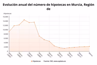 Las hipotecas sobre viviendas constituidas en la Región de Murcia han aumentado un 31,1 por ciento en marzo con respecto al mismo mes de 2018, frente a la media nacional que aumentó un 15,8 por ciento, según los datos difundidos este miércoles por el Instituto Nacional de Estadística (INE).