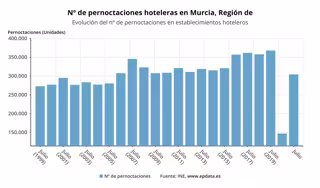 Los establecimientos hoteleros de la Región de Murcia computaron en julio un total de 304.423 pernoctaciones, de las que 264.388 correspondieron a viajeros españoles y las 40.035 restantes a viajeros extranjeros.