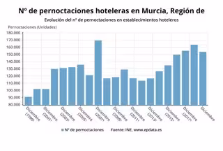 Los hoteles de la Región de Murcia computaron en diciembre un total de 153.640 pernoctaciones, de las que 124.263 correspondieron a viajeros españoles y las 29.377 restantes fueron de viajeros extranjeros, con una estancia media de 1,75 días frente a los 2,71 de la media nacional.