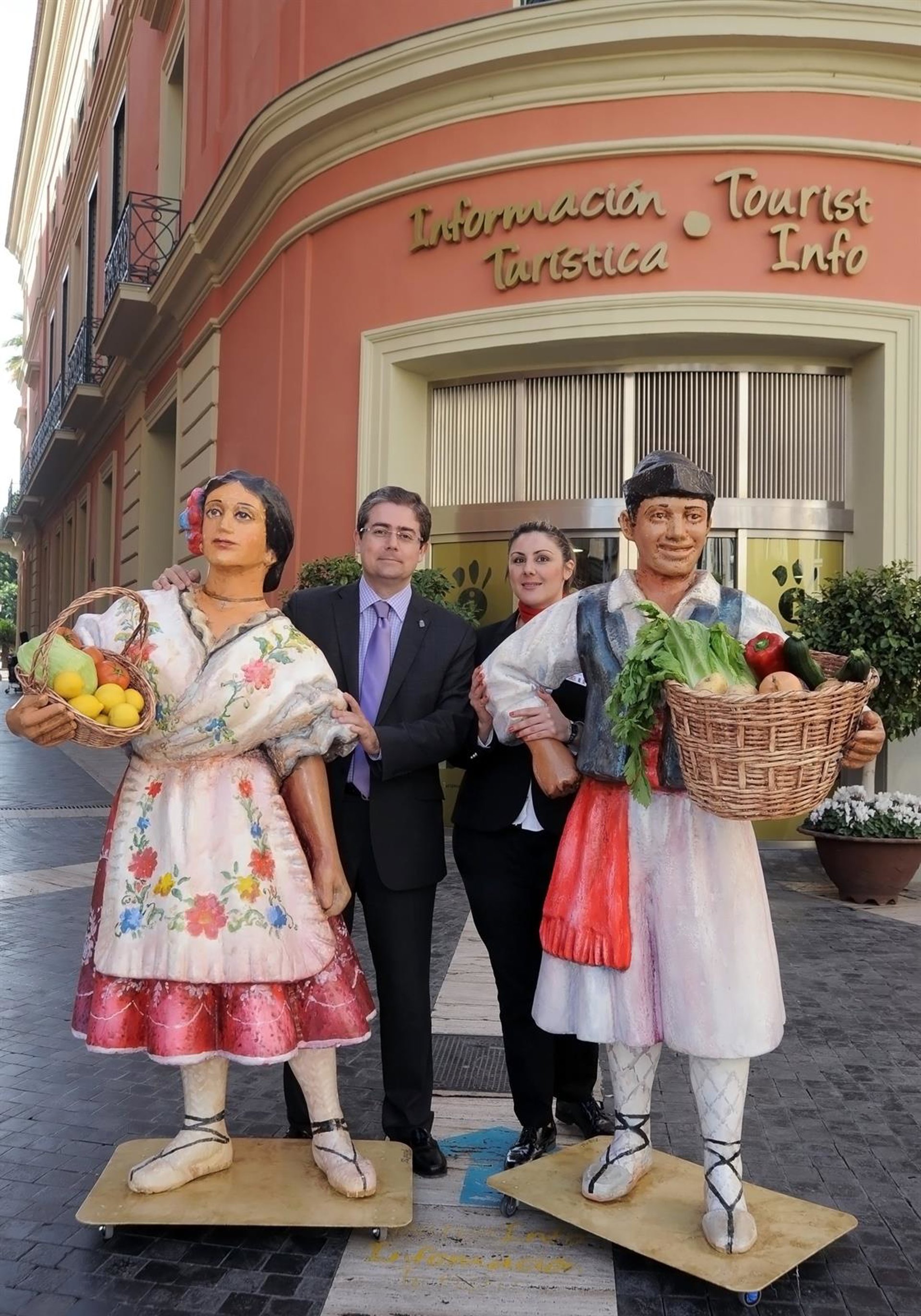 Dos reproducciones de un huertano y una huertana reciben desde este martes a quienes se acerquen por la Plaza Belluga. Los personajes, instalados en la entrada de la Oficina de Turismo, serán un reclamo para los turistas que lleguen a la ciudad y, al mismo tiempo, encarnarán unas figuras cercanas y próximas para todos los murcianos.