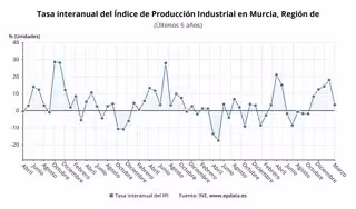 Tasa interanual del Índice de Producción Industrial en la Región de? Murcia en los últimos cinco años. - EPDATA