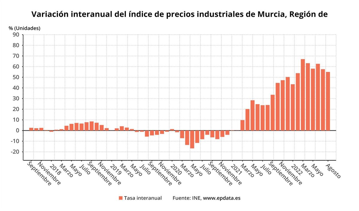 El Índice General de Producción Industrial (IPI) se disparó en la Región de Murcia un 55% en agosto respecto al mismo mes del año anterior, la cuarta mayor subida por comunidades autónomas, frente al incremento del 41,8% de la media nacional, según ha informado este lunes el Instituto Nacional de Estadística (INE).
