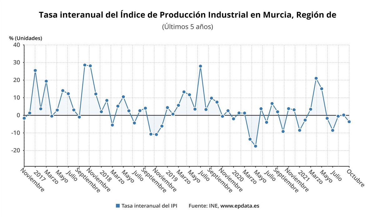 La producción industrial en la Región de Murcia en el mes de octubre de 2021 descendió un 3,6% respecto al mismo mes del año anterior. Para el conjunto de España también se registró un descenso interanual, en este caso del -3,3%, según los datos publicados por el Instituto Nacional de Estadística (INE) este viernes.