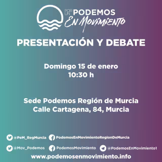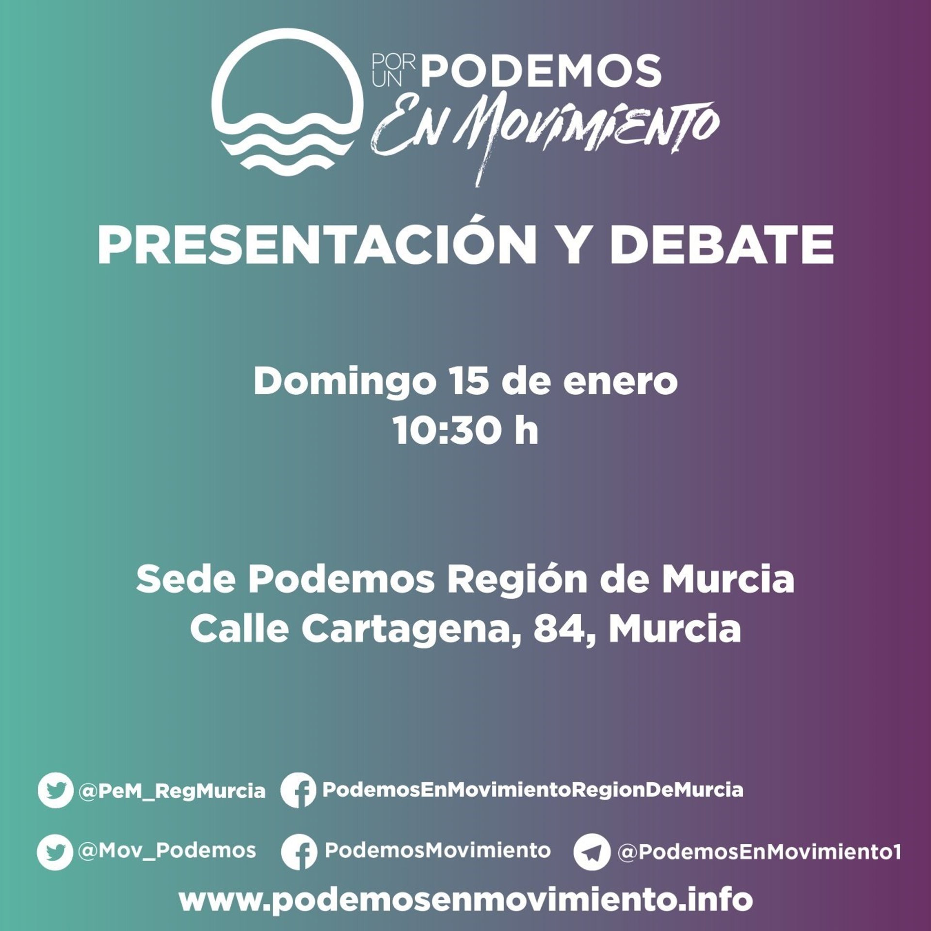 La propuesta Podemos en Movimiento, que es una de las que se debatirá en la II Asamblea Ciudadana de Podemos, en la que se definirá el modelo de partido, hace una presentación y debate en la Región el próximo domingo, a las 10.30 horas, en la sede de Podemos Región.