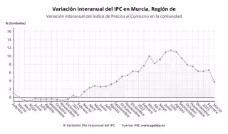 La tasa interanual de la Región de Murcia (4,6%) se sitúa por encima de la media en España (4,1%) y es solo inferior a la tasas de la ciudad autónoma de Melilla (5,8 por ciento) y la comunidad de Canarias (5,5 por ciento).