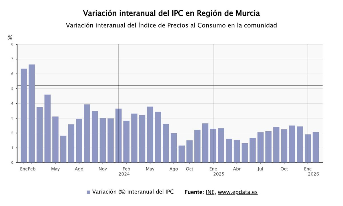 El Índice de Precios de Consumo (IPC) subió al 2,1% en Murcia en febrero en tasa interanual, 2 décimas por encima de la tasa interanual del mes anterior, según los datos definitivos publicados este viernes por el Instituto Nacional de Estadística (INE).