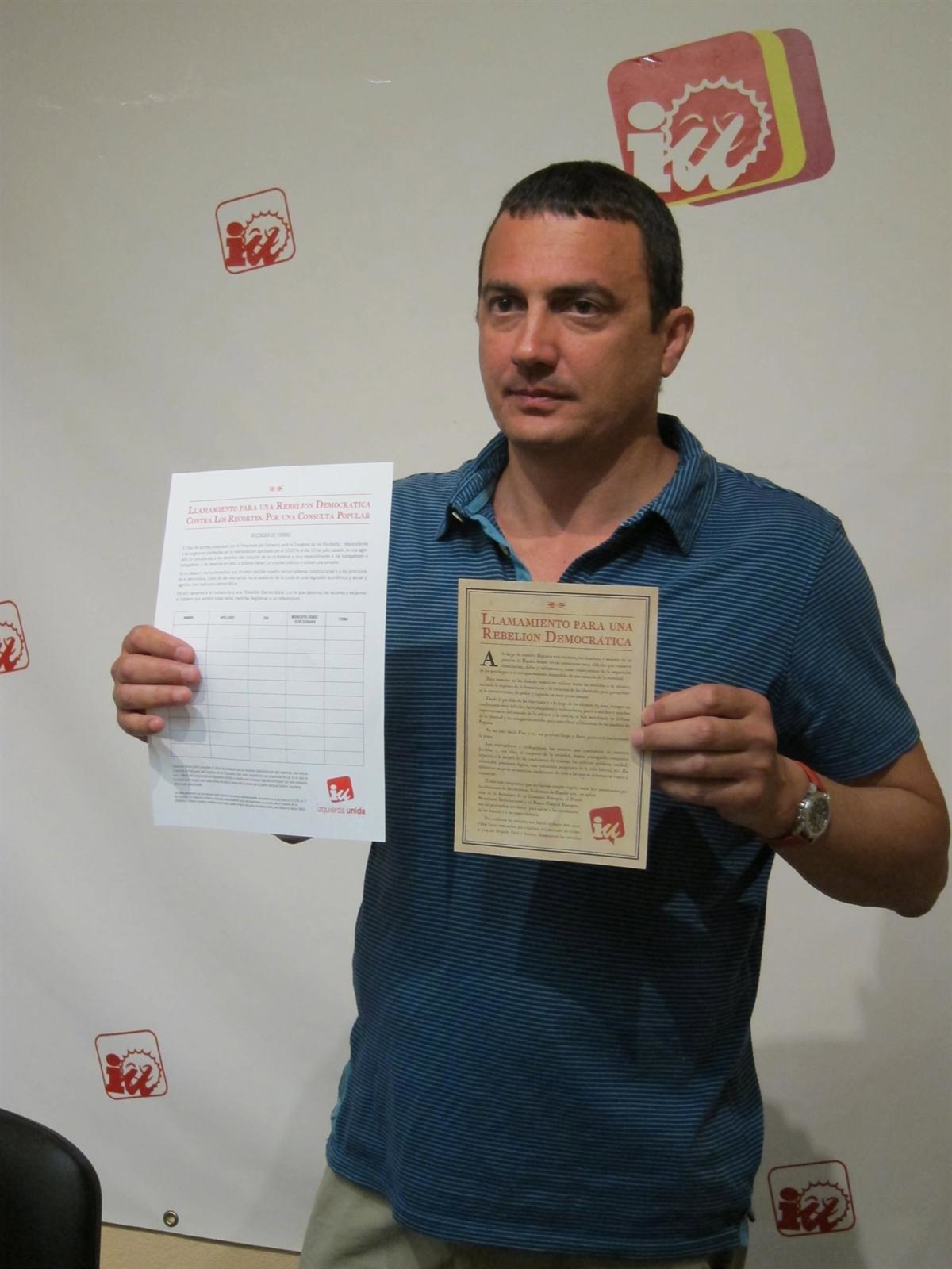 IU-Verdes va a iniciar este jueves una campaña de recogida de firmas que, bajo el lema 'Llamamiento para una rebelión democrática', pretende recoger firmas para forzar al Gobierno del presidente Mariano Rajoy a convocar un referéndum sobre sus medidas de "duros recortes sociales".