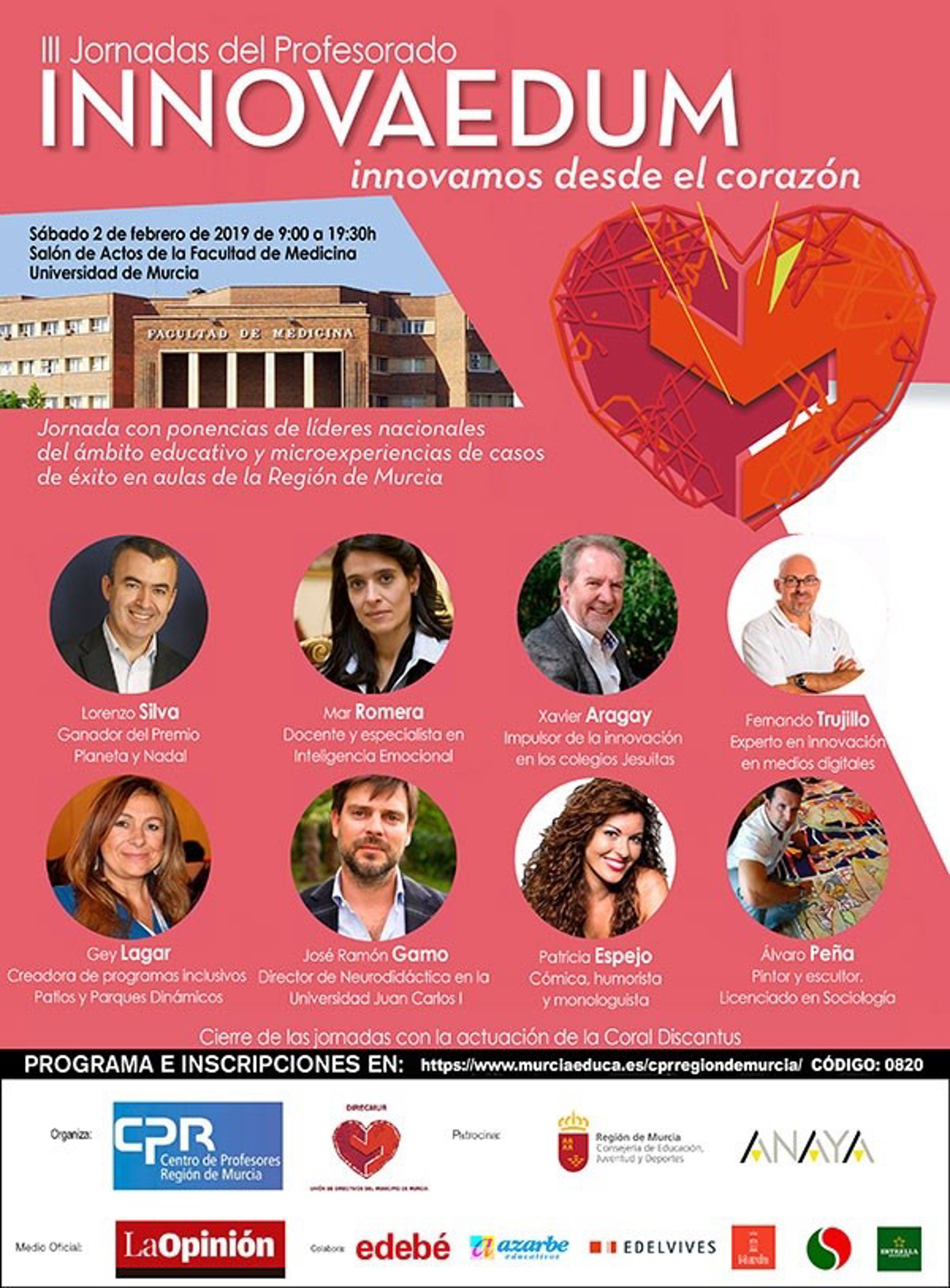 Profesionales de la talla de Mar Romera, Fernando Trujillo, Xavier Aragay, Gey Lagar, José Ramón Gamo, Lorenzo Silva y Álvaro Peña participan en las III Jornadas del Profesorado 'Innovaedum: Educamos desde el corazón', que se celebran en la Facultad de Medicina de la Universidad de Murcia (UMU) este sábado.