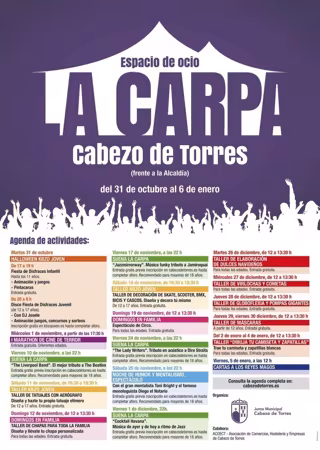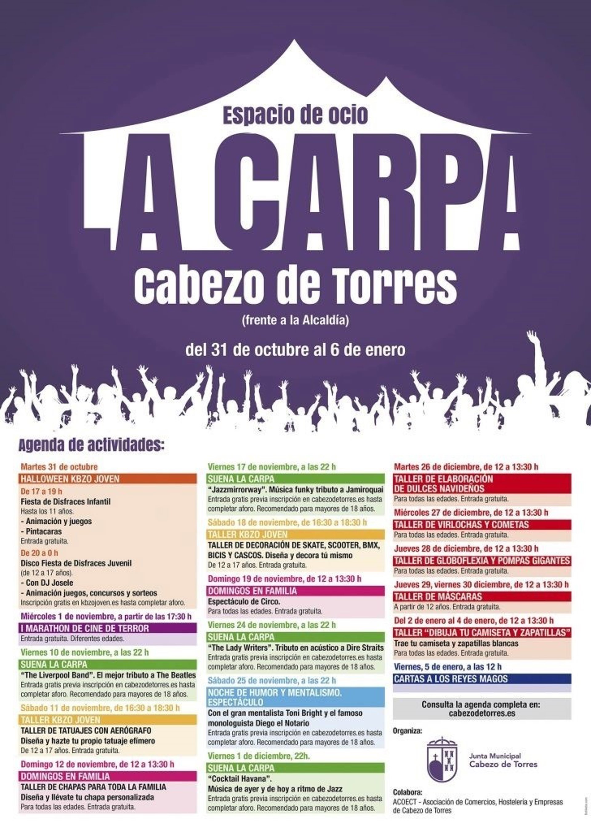 Las reservas e inscripciones podrán realizarse en la web 'https://cabezodetorres.es/la-carpa-espacio-ocio-cabezo-torre...' a partir del viernes 27 de octubre.