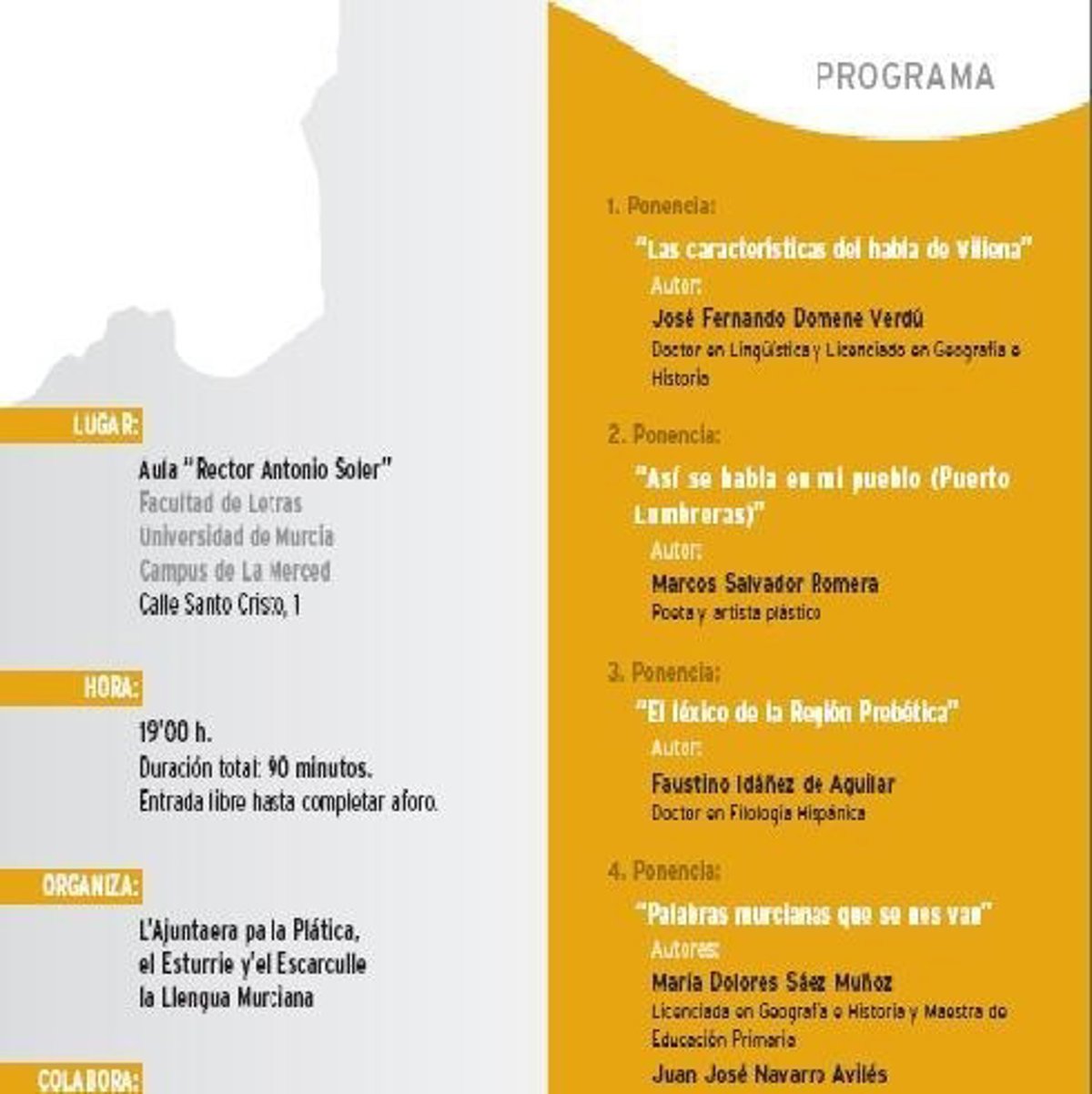 El doctor en Lingüística y Licenciado en Geografía e Historia, José Fernando Domene Verdú, ofrecerá la primera de las ponencias sobre 'Las características del habla de Villena'; mientras que el poeta y artista plástico, Marcos Salvador Romera, pronunciará una charla titulada 'Así se habla en mi pueblo (Puerto Lumbreras)'.