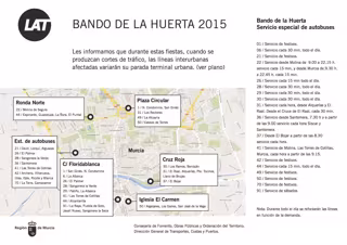 Un total de 18 de las líneas urbanas e interurbanas de LAT que recorren el municipio de Murcia y diversas localidades del área metropolitana, ofrecerán el próximo martes 7 de abril un servicio especial a todos sus usuarios con motivo del Bando de la Huerta 2015.