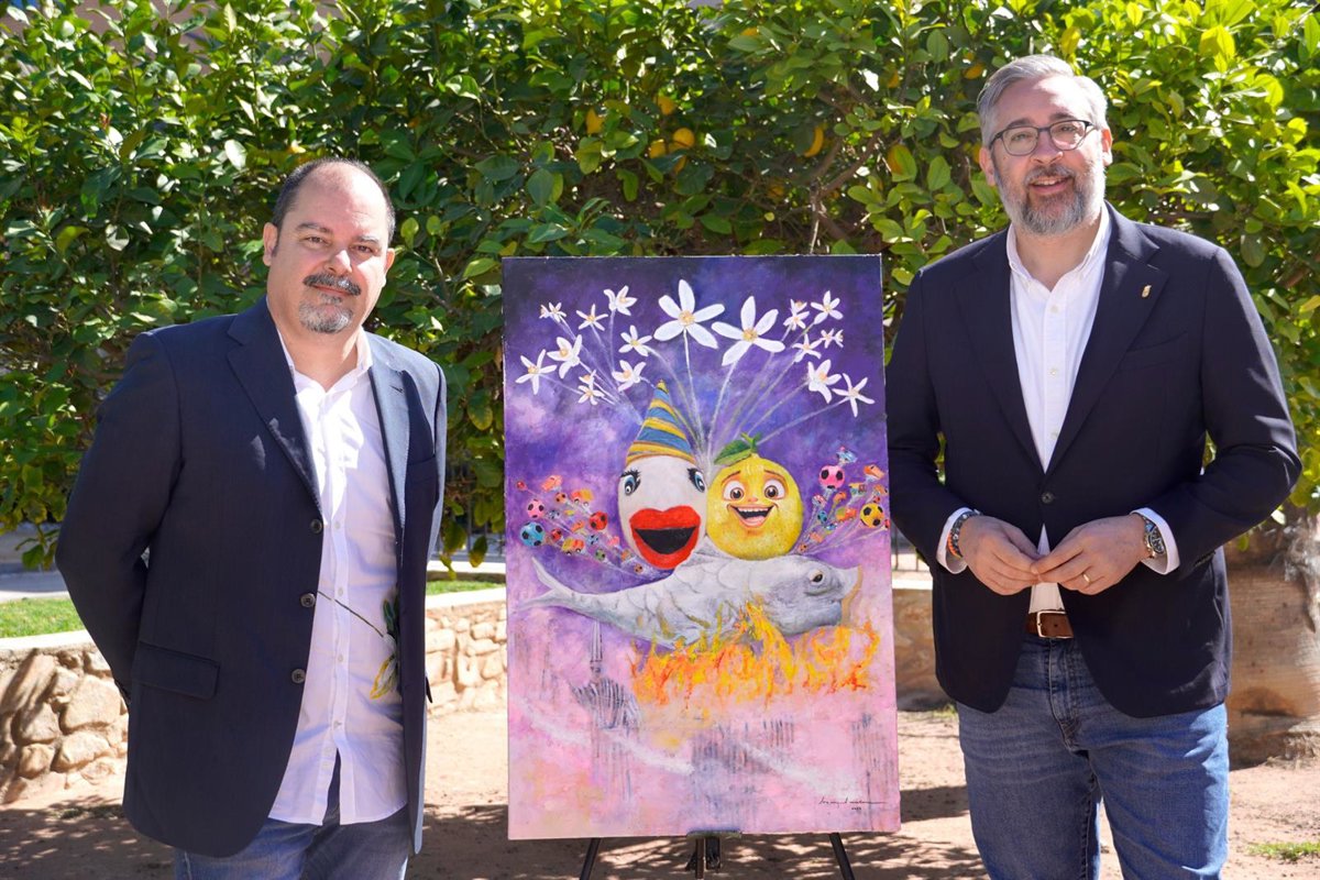El alcalde de Santomera, Víctor Martínez, acompañado del pintor José Miguel Muñoz, ha presentado este miércoles el cartel anunciador de Santomera como Municipio de Llegada del Entierro de la Sardina - AYUNTAMIENTO DE SANTOMERA