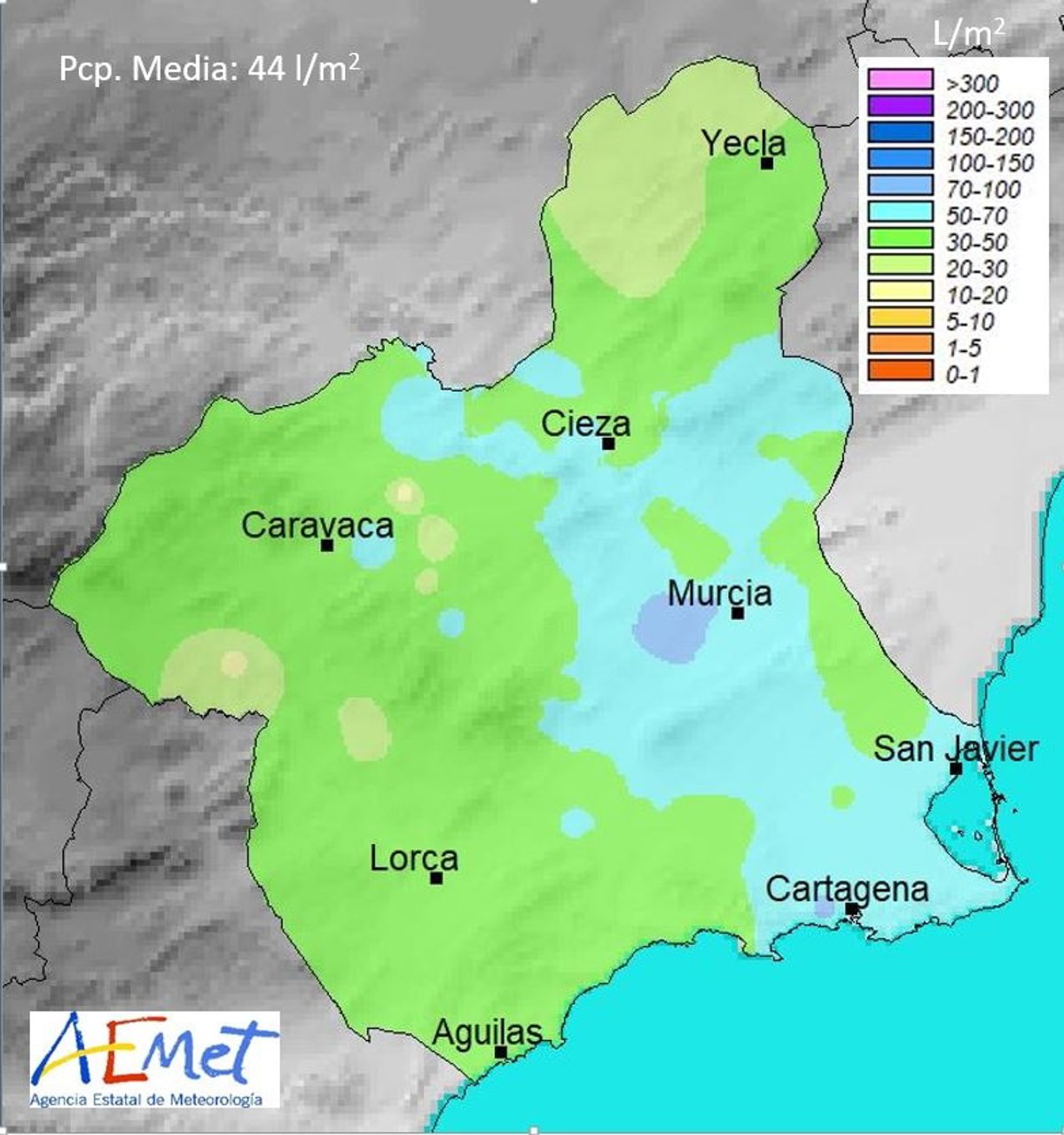 En los municipios de Torre Pacheco, Calasparra y Alhama no llovía tanto desde hace 14 años. Se registraron precipitaciones de 60,8 litros por m2 (31,6 litros por m2 en 2008) en la primera de las localidades, 52,2 litros por m2 (50,8) en Calasparra y 54,4 (37,6) en Alhama, respectivamente.