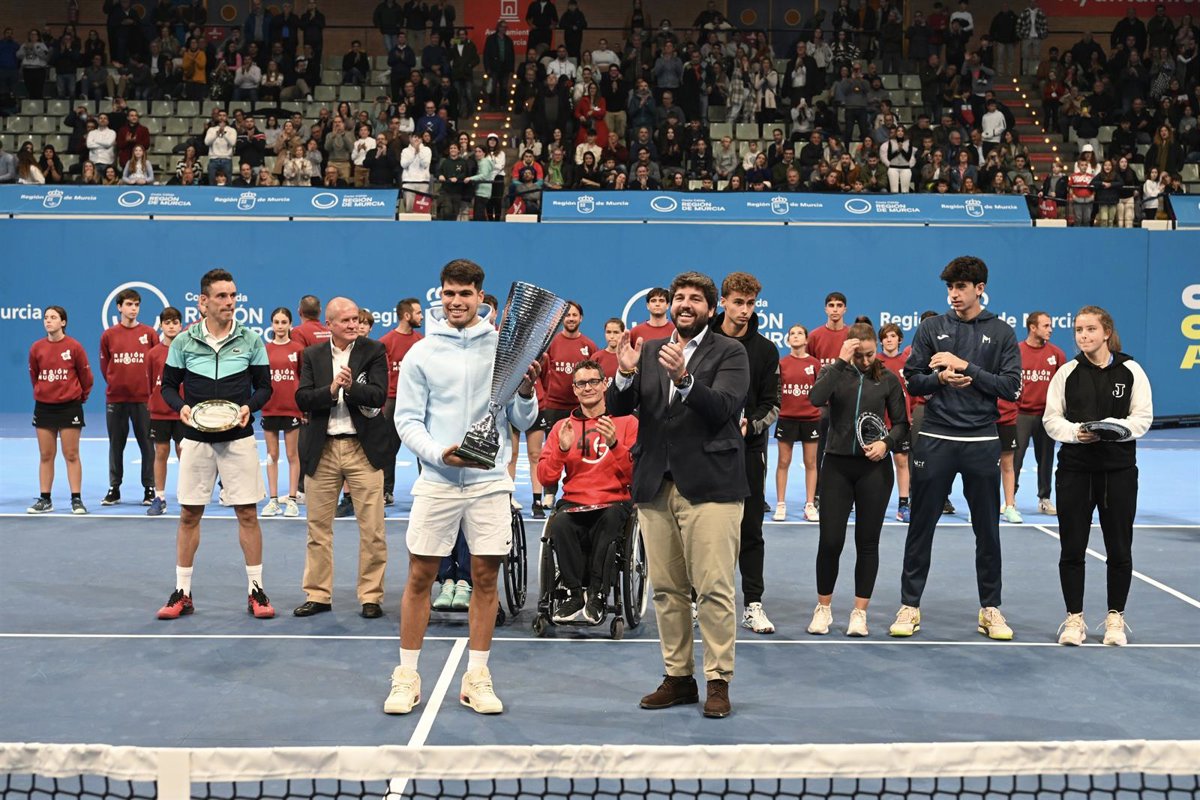 "Carlos ya lo sabía, pero hoy ha vuelto a comprobarlo: la Región de Murcia le quiere, y por eso queríamos verle jugar aquí por primera vez como profesional, para aplaudirle como merece", subrayó el máximo responsable autonómico durante su intervención. Para López Miras, el jugador de El Palmar "hace mejor la Región de Murcia con su tenis, con su cercanía, y siendo uno de los grandes embajadores de esta tierra en el mundo".