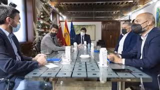 El jefe del Ejecutivo regional, Fernando López Miras, se ha reunido esta mañana con el presidente de la Diputación de Alicante, Carlos Mazón, y el presidente del Sindicato Central de Regantes del Acueducto Tajo-Segura (Scrats), Lucas Jiménez.