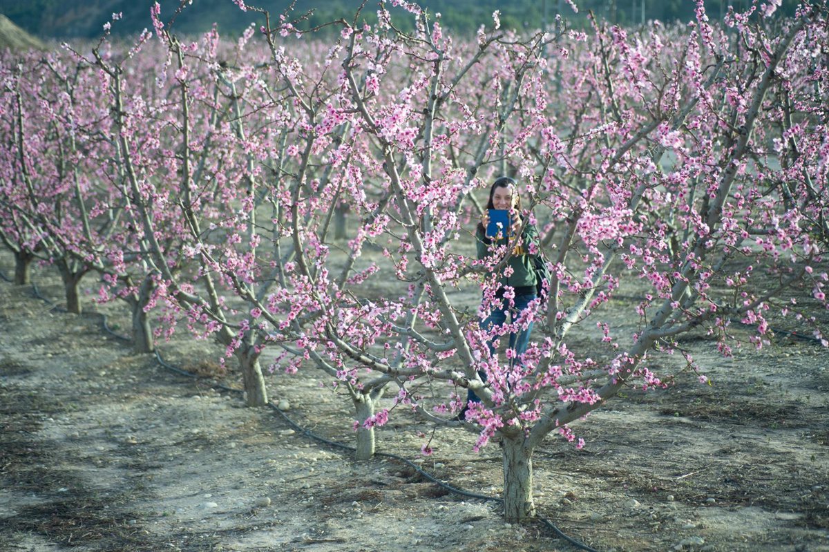 Una mujer se fotografía con los frutales en floración, a 10 de marzo de 2023, en Cieza, Región de Murcia (España). - Javi Carrión - Europa Press
