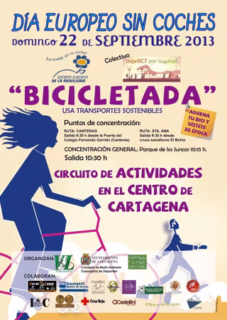 Por segundo año consecutivo, el Colectivo MoviliCT por tu Salud, compuesto por ciudadanas y ciudadanos, en colaboración con la Asociación Vía Libre y con el Ayuntamiento de Cartagena, llevan ya varios meses trabajando para que el domingo 22 de septiembre, todos los cartageneros y cartageneras, salgan a la calle, preferiblemente andando, en bicicleta o transporte público y se conviertan en los verdaderos protagonistas, al menos durante ese día.