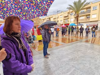 Decenas de vecinos y vecinas de Santomera se han concentrado hoy en la Plaza de la Salud, junto al centro de la Tercera Edad, para denunciar el recorte a las frecuencias los autobuses entre esta localidad y Murcia desde la entrada en vigor del nuevo mapa de movilidad.